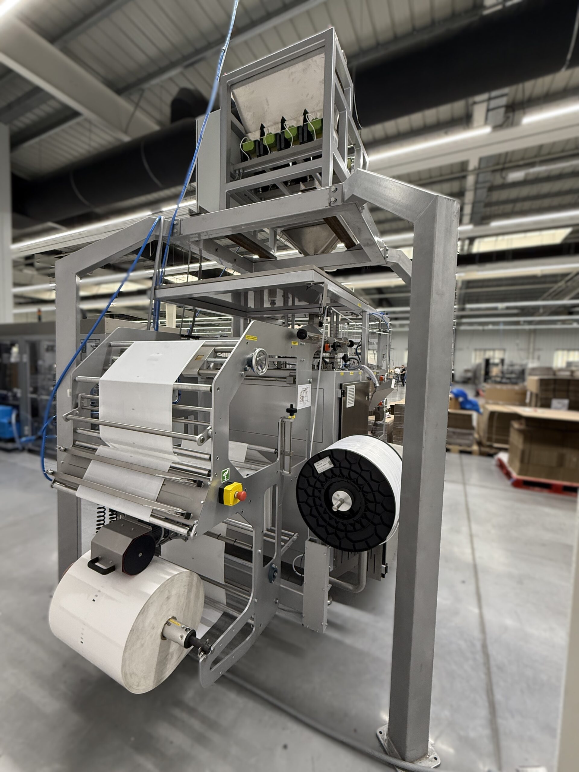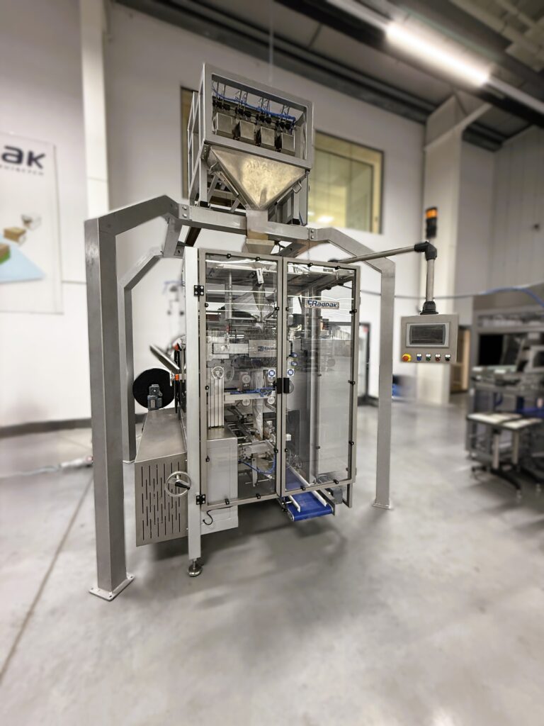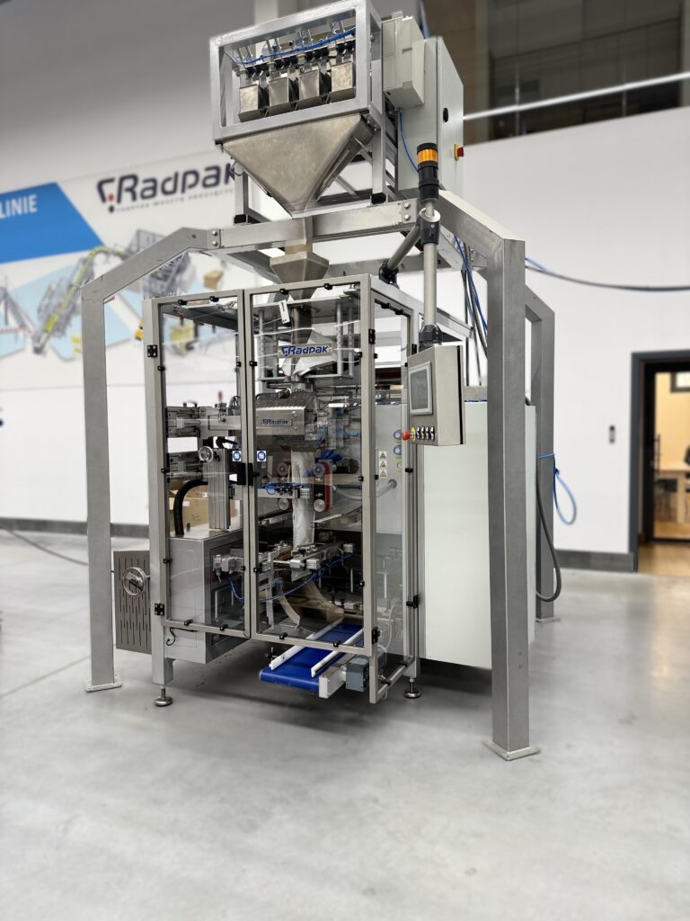Automatyczna maszyna pionowa do dozowania i pakowania produktów sypkich w torebki typu doypack oraz w torebki płaskie przy zastosowaniu dodatkowo obrotowej szczęki poziomej.